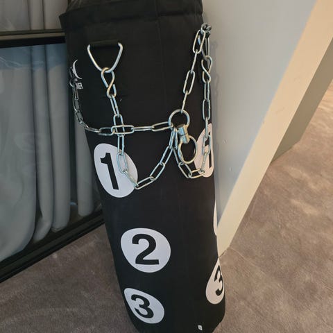 Kättingen är 9 mm tjock och är klädd med ett nylonöverdrag som dock blivit slitet, se bild. Den har löpögla vid ena änden.