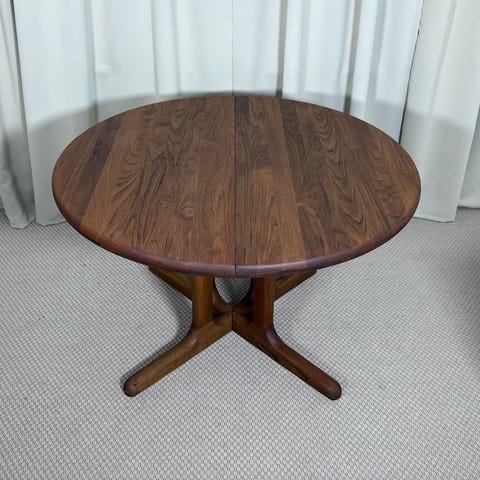 Runt matbord i trä i mörk körsbärsnyans. Bordet består av två halvcirkelformade delar som kan användas ihop som ett runt bord eller var för sig som halvmånebord mot vägg. Skivan har synlig trästruktur och bordet står på raka, avsmalnande ben. Delarna kan hakas ihop med beslag under skivan för att hålla bordet stabilt vid användning som helt bord.