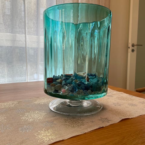 Den är handgjord på Bali av återvunnet glas och av balinesiskt Gammal-trä. Denna fantastiska smälta konstglasvas förenar det bästa av två världar, naturligt, konstgjort, jordnära och elegant.