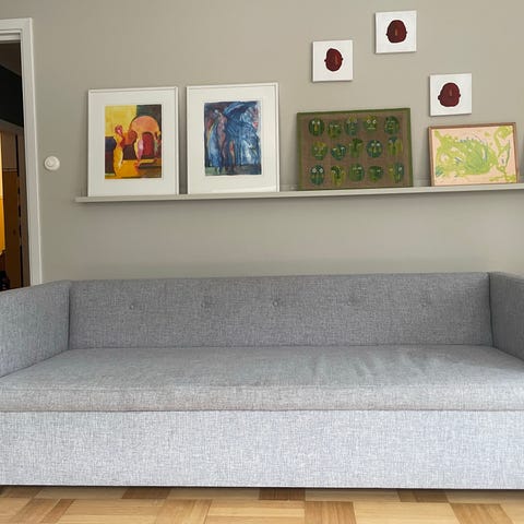 MELIMELIs 3-sitssoffa i Howard-modell. Sits och ryggkudde i bra skick - form välbehållen. Tyget i behov av tvätt, men inga hål eller revor. Två lösa kuddar, viss skada på båda. Nypris 27 995 kr.
