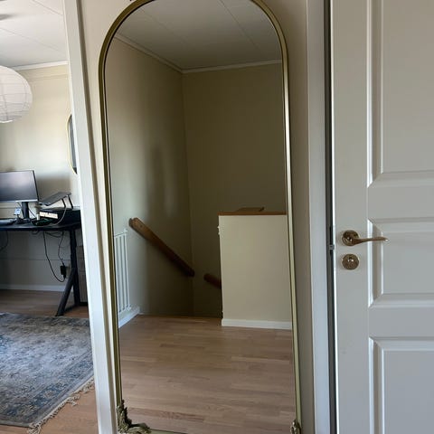 IKEA PIRAL spegel med rektangulär form och guldfärgad ram. Spegeln har en profilerad ram i trä med tvinnat dekorativt mönster längs innerkanten. Baksidan är försedd med upphängningsbeslag för montering på vägg, se bild. Passar exempelvis i hall, sovrum eller vardagsrum som helkroppsspegel eller större väggspegel.