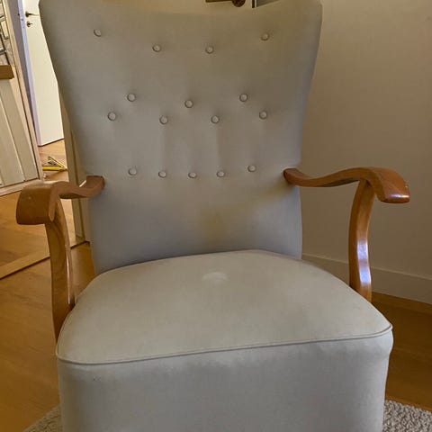 Fåtölj 50-tal omklädd på tapetserarverkstad till rött tyg. Original öronlappsfåtölj i gult ulltyg. Osäker på märke och designer.