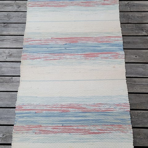 3 st slätvävda mattor i blandade färger. Fint ikatmönster. Lättplacerade, tack vare deras form, storlek och färgblandning. Av bomull. Tål maskintvätt. Från ett djur- och rökfritt hem.