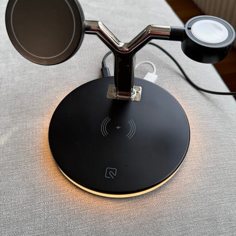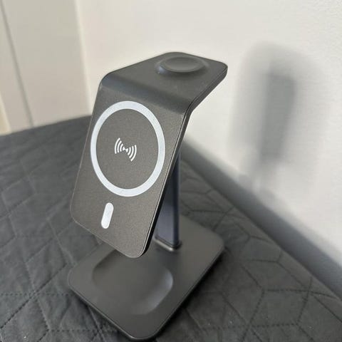 Mobique 3-i-1 trådlös laddningsstation i svart färg. Stativet har en plan laddningsyta samt upphöjda laddningsytor för flera enheter samtidigt, till exempel mobiltelefon, hörlurar och klocka som stödjer trådlös laddning. Undersidan har halkskydd för stabil placering på bord eller hylla och en anslutning för strömkabel på sidan. Lämplig som stationär laddningslösning i hemmet eller på kontoret för kompatibla enheter med trådlös laddning.