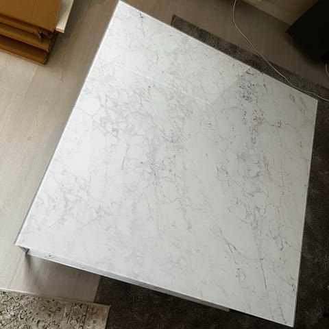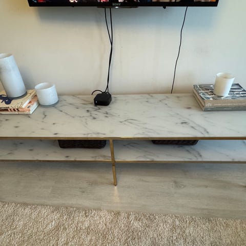 Amanda soffbord och tv-bänk i vit marmor till salu. Inköpt på Mio för några år sedan.