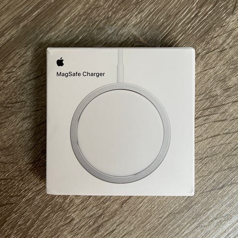 Apple laddare i vit färg. Trådlös laddplatta med fast kabel och USB‑C‑kontakt, avsedd för kompatibla Apple-enheter som stödjer trådlös laddning.