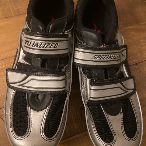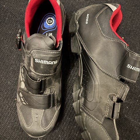 Bontrager spinningskor med pedalklossar, storlek 43. Skorna är svarta med tre kardborreband för justerbar passform. Ovandel i syntetmaterial med perforeringar för ventilation. Använd två ggr.