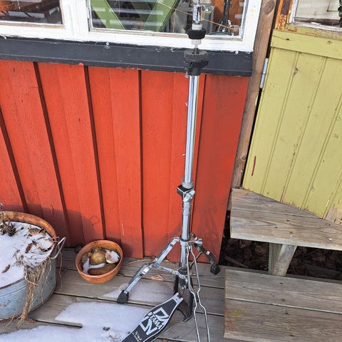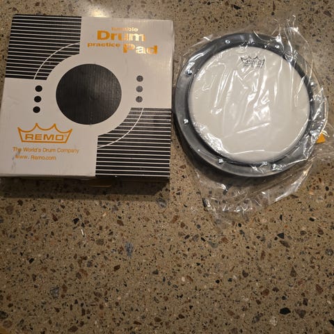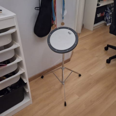 Hannox övningspad monterad på justerbart stativ. Spelytan är röd med åttakantig form och svart kant. Stativet är i metall med tre ben och gummifötter för stabilitet. Passar för trumövning i hemmet, replokal eller undervisning där dämpad ljudnivå önskas.