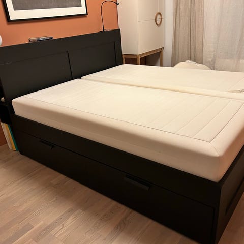 IKEA säng med sänggavel i trä. Passar två personer och är avsedd för användning i sovrum. Sängen har en rak huvudgavel och används här med dubbeltäcke och flera prydnadskuddar (textilier ingår eventuellt inte beroende på överenskommelse). Lämplig som standardsäng i hemmet eller gästrum.