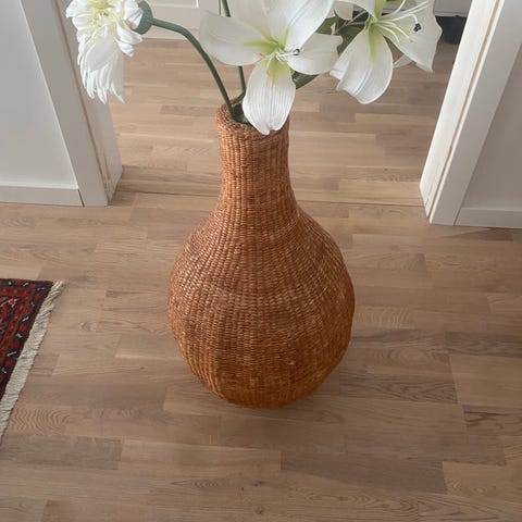 Stor jute golv vas. Detta är en super snygg inredning att sätta lite pinnar i med belysning.