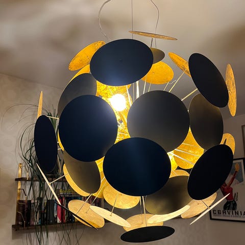 Fint skick. Nypris ca 4 500 kr ( se här https://www.byrydens.com/se/produkter/taklampor/planet-taklampa-o50cm-sandsvart-guld)