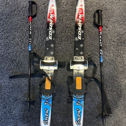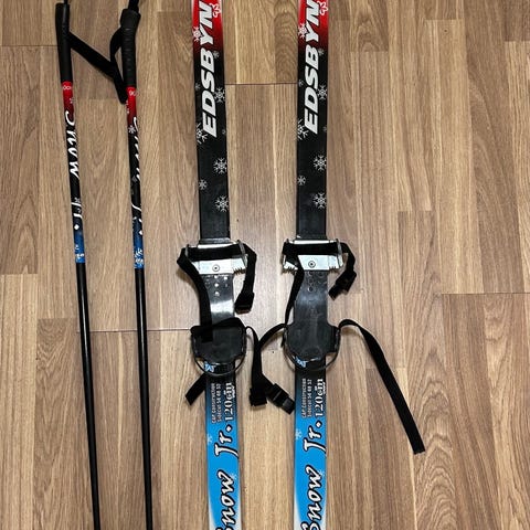 Edsbyn Snowcat längdskidor med stavar i blå färg. Skidorna har bindningar för montering av skor och är anpassade för längdåkning. Medföljer ett par stavar.