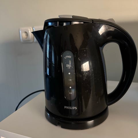 Philips vattenkokare med ställbar temperatur. Vattenkokaren är vit med detaljer i rostfritt stål och grått handtag. På handtaget finns knappar för att välja temperatur, bland annat 40, 60, 80 och 100 grader, samt en knapp för varmhållningsfunktion. Nivåfönster på sidan visar vattenmängden. Insidan är i rostfritt stål och locket har röda plastdetaljer. Passar för uppvärmning av vatten till te, kaffe och annan dryck där olika temperaturer önskas.