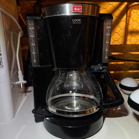 Melitta Enjoy kaffebryggare i svart utförande. Bryggaren har glaskanna med handtag och droppstopp vid filterhållaren. Passar för bryggning av flera koppar kaffe åt gången i hemmet eller på kontoret. Klassisk eldriven filterkaffebryggare med enkel manuell hantering via strömbrytare på sidan.