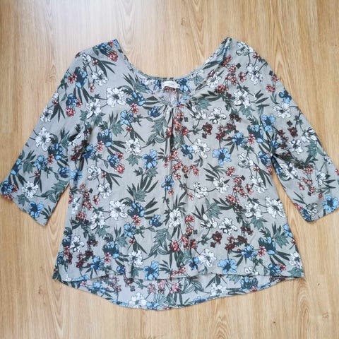 Mingel blus för dam i storlek XXL. Blusen är flerfärgad med blommigt mönster. Modellen har trekvartsärm och V-ringning. Passar som vardags- eller kontorsplagg och kan kombineras med exempelvis jeans eller kjol.