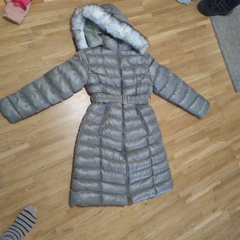 Vinterjacka för dam i storlek L. Jackan är blå och har quiltat mönster. Modellen är längre och har huva samt dragkedja framtill med knäppning. Fickor framtill med dragkedja. Passar som varm ytterjacka under kallare säsong.