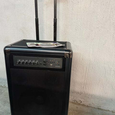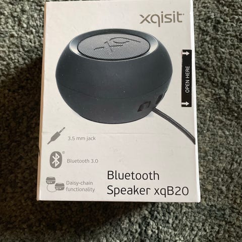 Snygg stilren bluetooth högtalare från Georg Jensen Damask. Grått tyg med sidor och handtag i metall. Kabel medföljer