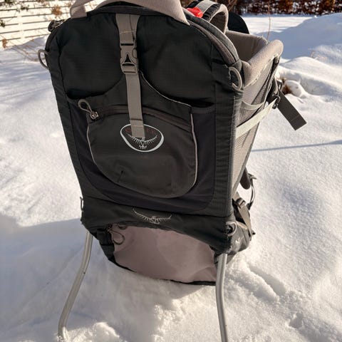 Osprey Poco barnbärstol ryggsäck i blå och svarta toner. Ryggsäcken har bärstol för ett barn med sittdel, sele och sidonät för ventilation. Justerbart bärsystem med vadderade axelremmar, bröstrem och höftbälte ger stöd för den vuxne bäraren. Inbyggt stativ gör att barnbärstolen kan ställas ned stadigt på marken vid i- och urstigning. Passar för vandring och utomhusaktiviteter där barnet behöver kunna bäras bekvämt under längre sträckor.