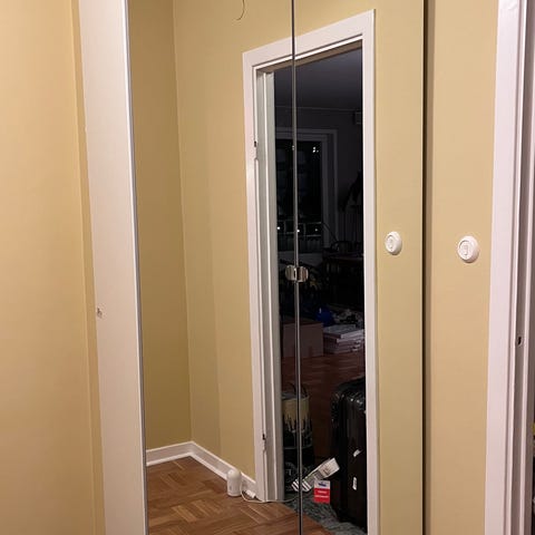 Pax garderob med en spegeldörr. Två små skador (se bilderna) på en av dörrarna, några små skador på insidan. Gjort hål i bakstycket för ett vägguttag (se bild). Annars bra skick. Garderoben är nedmonterad. Nypris runt 4000 SEK.