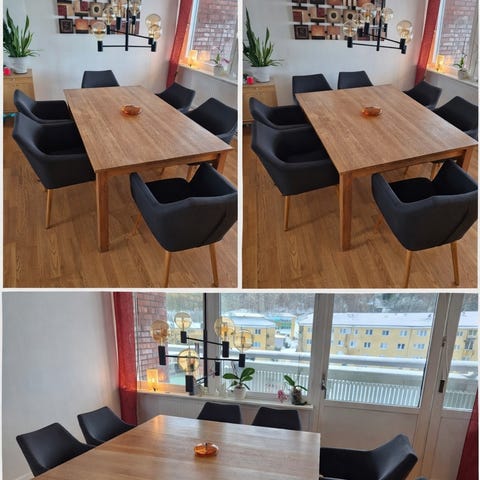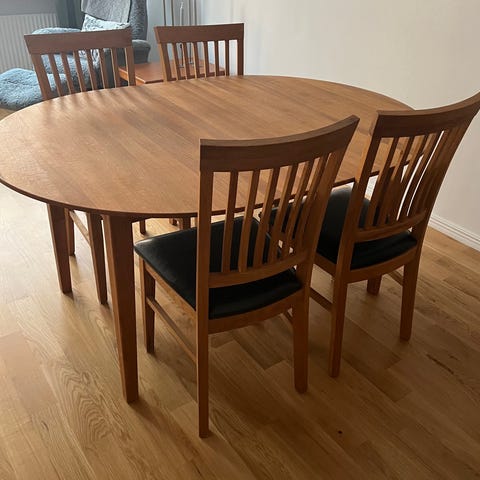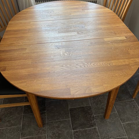 Matbord i ljus bok med två iläggsskivor. Varje skiva är 50x105 cm. 6 bekväma stolar med mönstrad blå dyna. Vissa dynor har fått en viss missfärgning.