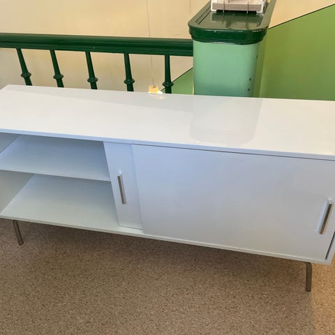 Stilren TV-bänk i vitt med skjutdörrar och guldfärgad lucka. Begagnad i gott skick med mindre bruksspår.