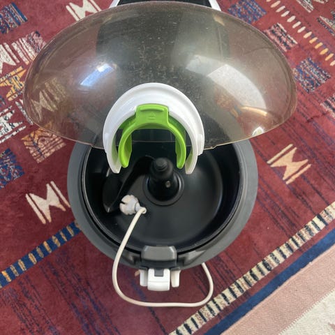 OBH Nordica fritös i rostfritt stål med svart lock och handtag. Utrustad med löstagbar friteringskorg i metall och synlig värmeslinga i botten. Temperaturreglage och kontrollpanel sitter på ovansidan. Passar för fritering av till exempel potatis, grönsaker och andra livsmedel i hemmet.