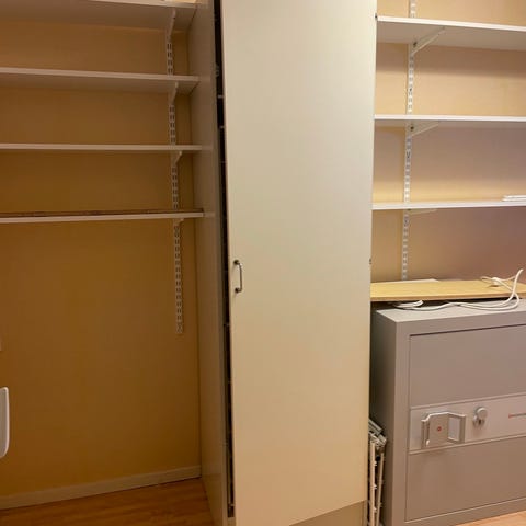 Förvaringsskåp med hyllor och trådkorg i vit färg. Skåpet har flera fasta hyllplan för förvaring av kläder, textilier eller andra saker samt en nedre trådkorg för extra förvaring. Passar i klädkammare, förråd eller annan förvaringsyta där man behöver överskådlig och praktisk förvaring.