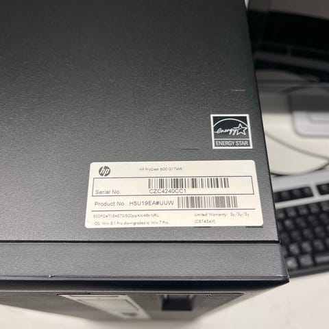 Chassit är ett kompakt torn med flera USB-portar och ljudanslutningar på framsidan. Systemet körs i 64-bitarsläge med Windows-baserat operativsystem enligt skärmbilden.