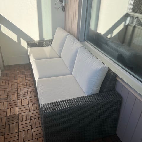 Utemöbel loungesoffa i konstrotting med vita dynor. Soffan består av flera moduler som kan ställas ihop till hörnsoffa eller separata sittdelar. Brun konstrottingstomme med armstöd och ryggstöd samt tjocka sitt- och ryggdynor i vitt tyg. Passar för uteplats, altan eller balkong som sittgrupp för flera personer.