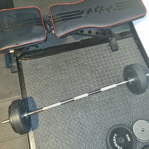 En skivstångsställning i metall i grå och röd från K-Sport. Två stycken hållare, se bild 1.