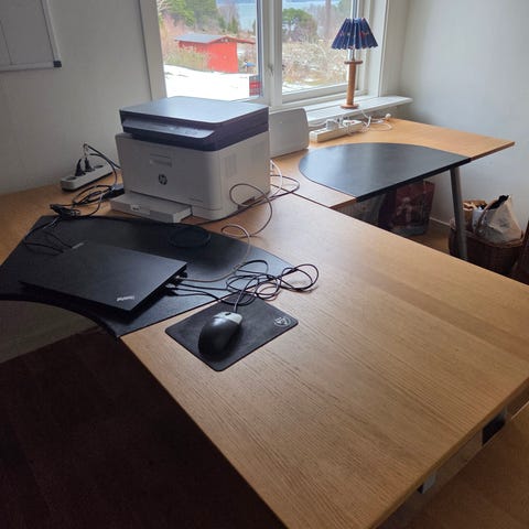 Fint och robust vinkel skrivbord med hylla och låd hurts. Mått 160/dj80cmx200/dj40 cm H=74. Finns i Råneå.