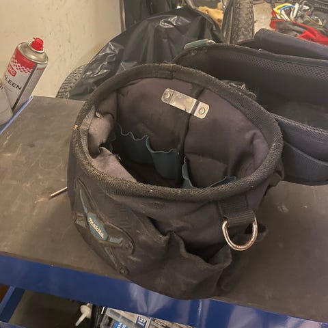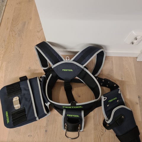 Snickers Workwear verktygsbälte med hängslen i storlek M (48–54). Bältet är svart och utrustat med flera fickor och hållare för verktyg, spik och skruv. Justerbara hängslen med snabbspänne ger avlastning för midjan. Passar för hantverkare och andra yrken där många verktyg behöver bäras lättåtkomligt under arbete.