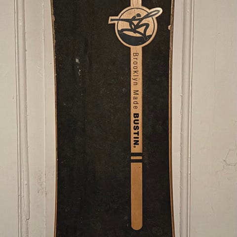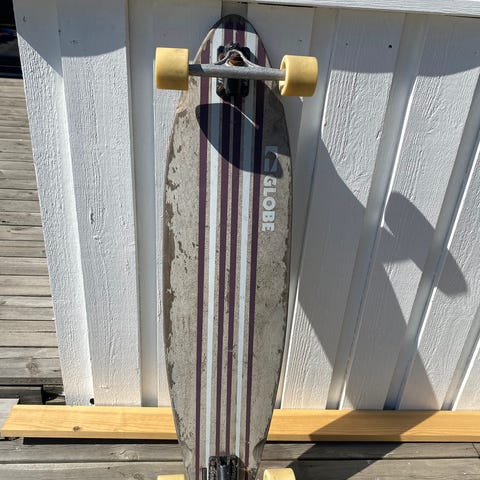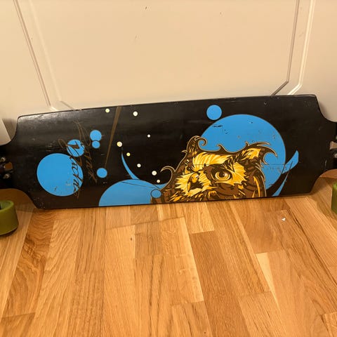 Longboard med träbräda och svart grepptejp på ovansidan. Brädan har utskurna hjulhus och röda hjul. Passar för cruising och pendling på jämna underlag. Enkel konstruktion med truckar monterade under brädan och standard kullager i hjulen.