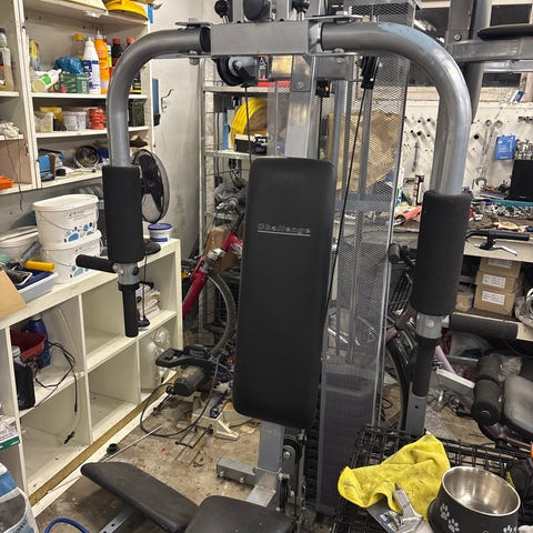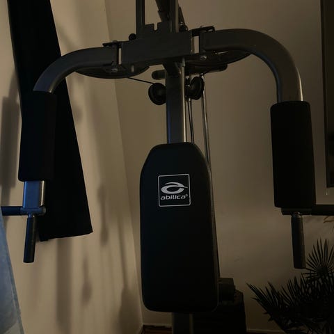 Sportig multigym träningsstation i svart utförande. Utrustad med viktmagasin med flera viktplattor och vajersystem för olika styrkeövningar. Maskinen har sittdyna och ryggstöd med vaddering samt arm- och handtag för bröst- och axelövningar. Övre del med fäste och trissa för dragövningar. Lämplig för styrketräning av överkropp och vissa benövningar i hemmagym eller liknande miljö.