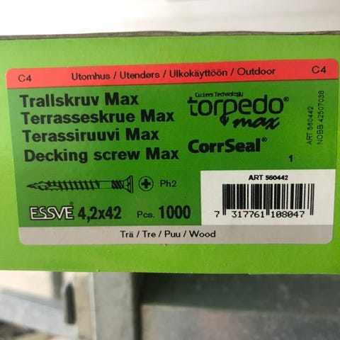 Torpedo Max trallskruv 4,5x55mm CorrSeal. Försänkt trallskruv avsedd för montering av trall och altankonstruktioner utomhus. Förpackningen innehåller 1000 skruvar i dimension 4,5x45 mm med CorrSeal-behandling anpassad för utomhusbruk. 500:- lådan, finns 6st. Bandad
