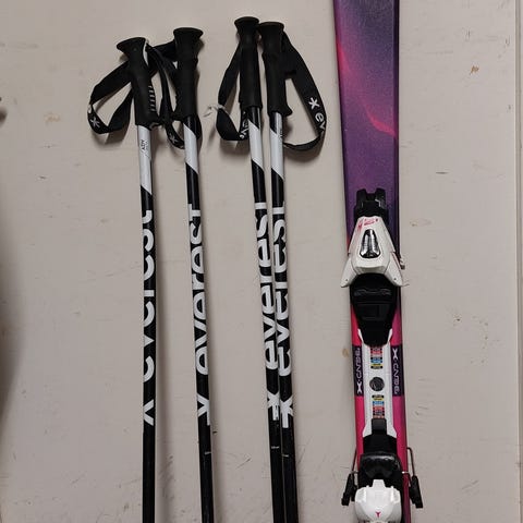 Slalomskidor av äldre model passar bra för nybörjare. 100:-