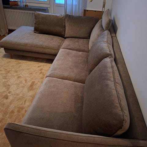 Soffan är städad med textildamsugare och har inga fläckar eller missfärgningar.