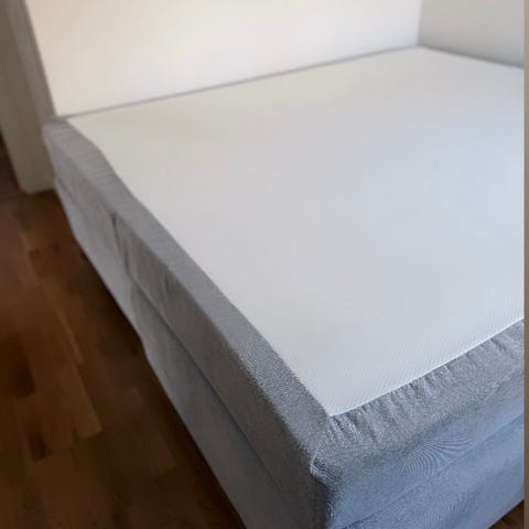 Mio säng i tygklädsel i grå ton. Sängen har en stoppad ram och står på ben, med madrass och bäddmadrass ovanpå. Passar som vanlig säng i sovrum eller gästrum.