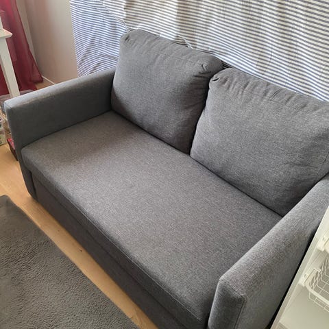 Mio bäddsoffa i mörkgrå tygklädsel. Soffan har två sittdynor, två ryggkuddar och en justerbar nackkudde. Rak modell med armstöd på båda sidor. Kan användas som soffa dagtid och som extra sovplats vid behov.