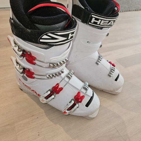 Head pjäxor i vit, svart och röd färg. Bra för barn. Stl 250/255. Modellen har flera justerbara spännen framtill för stabil passform och stöd. Passar för alpin skidåkning.
