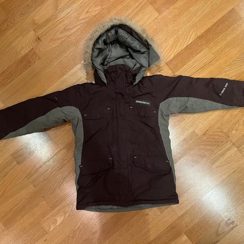 Fin jacka i bra skick. Många bra fickor och går ned på ryggen för bra skydd. Stl 140.