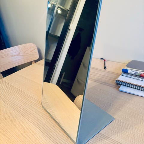 Ferm Living spegel med öron i läder. De kan knäppas loss med tryckknappar.