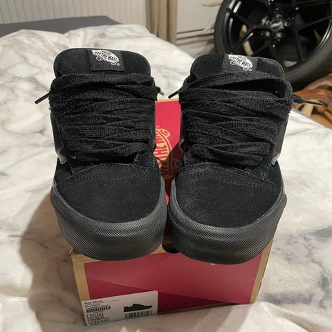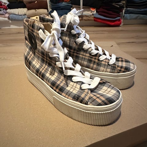 Vans sneakers i storlek 41. Höga sneakers med mönstrade sidopaneler och vit gummisula. Ovandel i textil med snörning framtill och vadderad öppning för fotleden. Klassisk Vans-sula i gummi med våffelmönster undertill. Passar som vardagssko eller fritidssko.