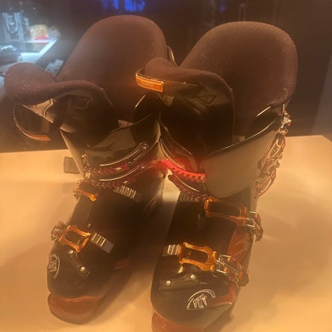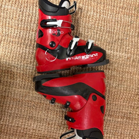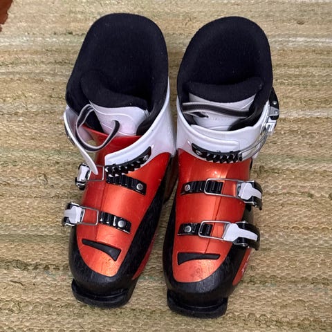 För barn. Salomon T2 alpina pjäxor med måttet 259 mm. Färgkombination orange och svart med vita spännen. Modellen har två justerbara spännen framtill för att ge stabil passform.