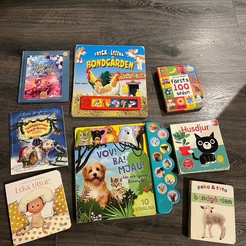 Fina och relativt varsamt använda barnböcker för de yngsta. ”Tjocka sidor” på alla. 15 stycken, till exempel: