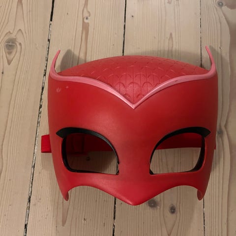 En svart maskerad mask, funkar bra till Halloween. Har två svartröda spindlar vid ögonen.