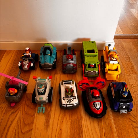 Paketet innehåller flera olika fordon i olika storlekar och färger, bland annat större blå räddningsfordon, mindre bilar, flygplan och arbetsfordon samt ett större lekset med ramp/torn. Flera små figurer ingår som kan placeras i fordonen. Leksakerna är färgglada och anpassade för barn som gillar Paw Patrol och fordonslek inomhus.