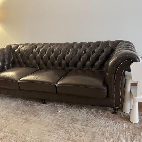 Snygg chesterfield seeef soffa i orange brunt läder