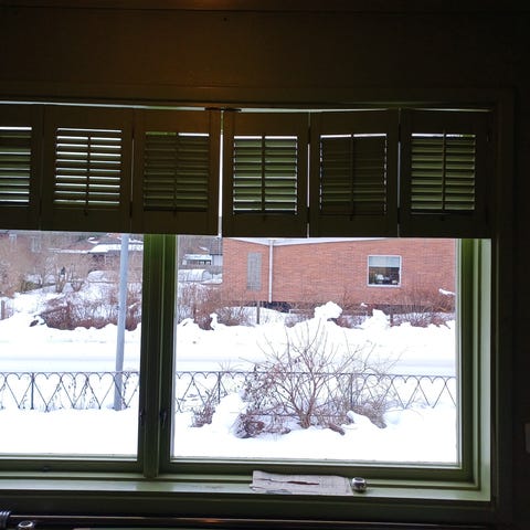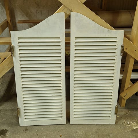 Fyra vita fönsterluckor som går att vika på tre. Hängs innanför fönstren på små piggar i fönsterkarmen. Samtliga är hela men kräver lite kärlek för att bli snygga.