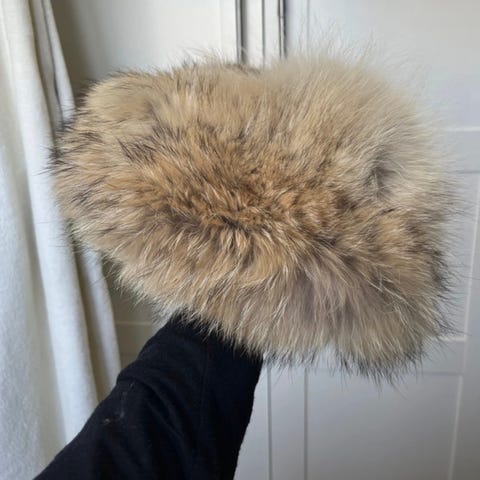Mössa/sjal med fuskpäls från HPI of Sweden, den är mörkt blå. Päls runt huvudet & i ändarna på sjalen som små bollar. I fint använt skick.